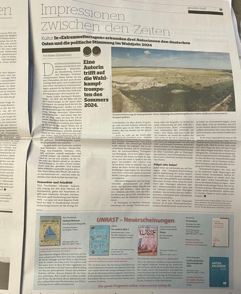Im ak empfiehlt Maike Zimmermann unser Buch „Extremwetterlagen. Reportagen aus einem neuen Deutschland“.